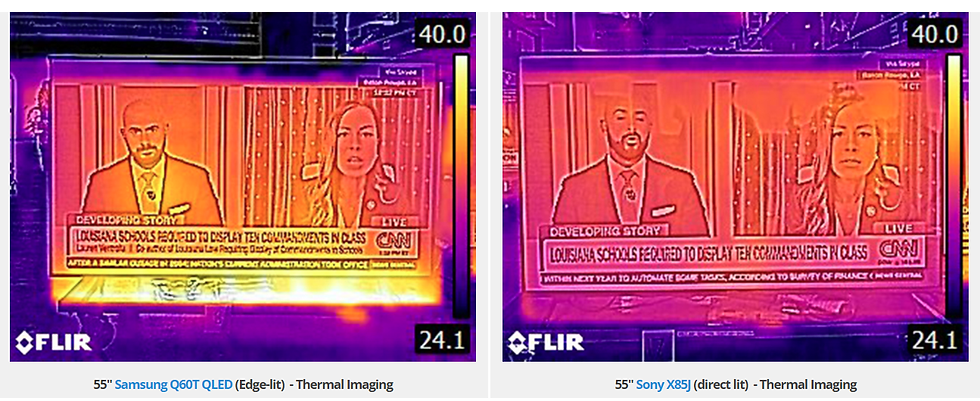Back in October of 2022, RTINGS.com launched a longevity test on 100 TVs which have run for over 10,000 hours since. The goal was to push the displays to the limits of their durability and examine failure points as they occur. The results of this research provided interesting information. For a start, edge-lit displays had problems with warped reflector sheets, cracked light guide plates, and burnt-out LEDs. The root cause of this was primarily the concentrated heat generated by the edge-lit LED strips. Below you can see the heat distribution.